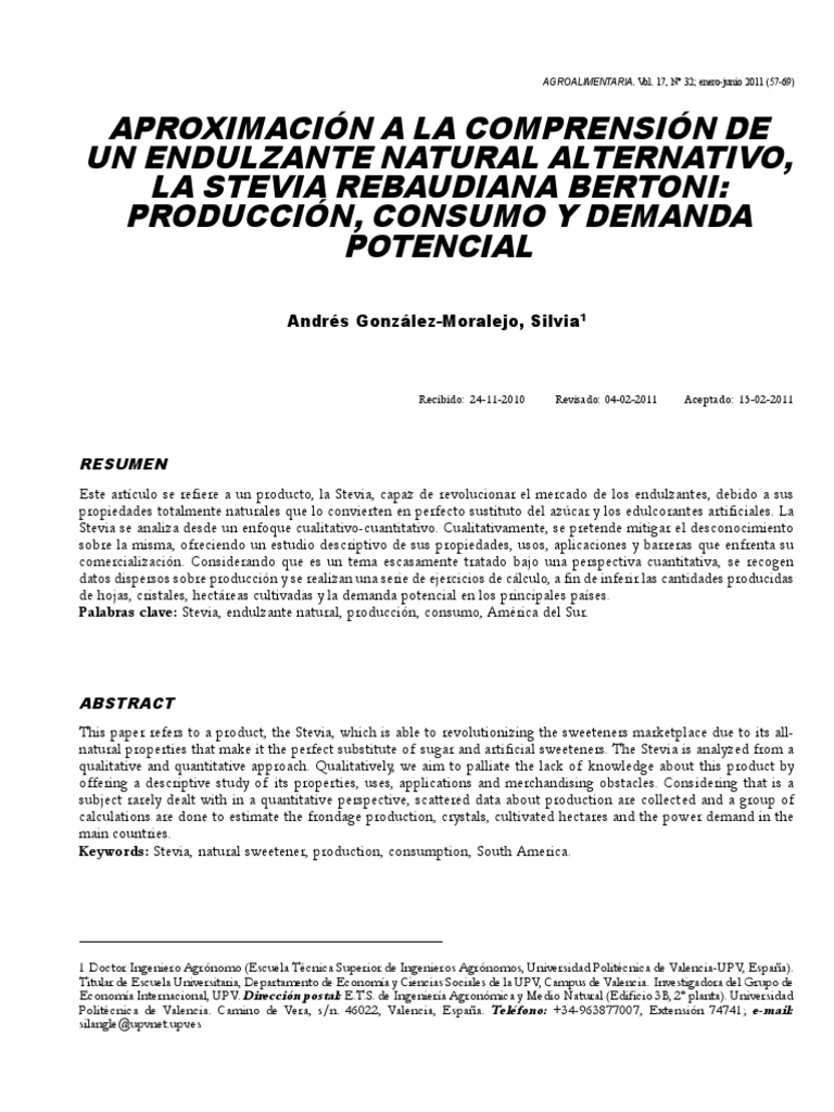 APROXIMACIÓN A LA COMPRENSIÓN DE UN ENDULZANTE NATURAL ALTERNATIVO, LA STEVIA REBAUDIANA BERTONI: PRODUCCIÓN, CONSUMO Y DEMANDA POTENCIAL