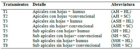 apical con o sin hojas, y dos tipos de sustratos: humus de lombriz y